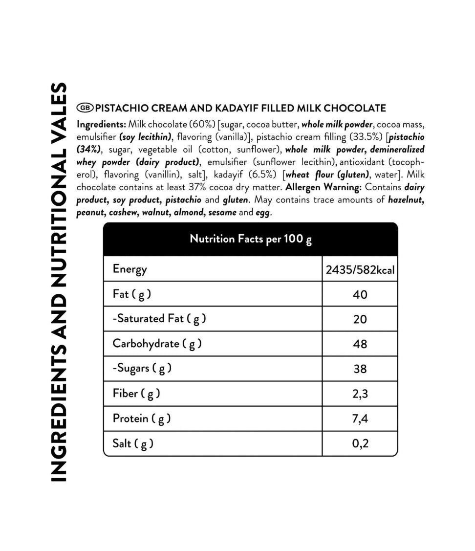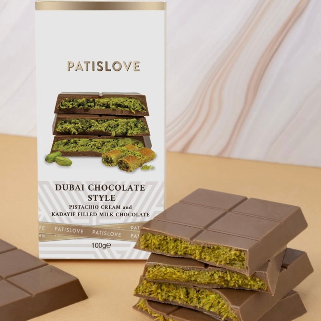Experience true luxury with Patislove Dubai-Style Milk Chocolate, crafted in Turkey. Each 100 g bar combines rich milk chocolate with smooth pistachio cream and crispy golden kadayif, offering a perfect mix of creamy and crunchy textures. A delicious treat inspired by the flavors of Dubai’s finest desserts.