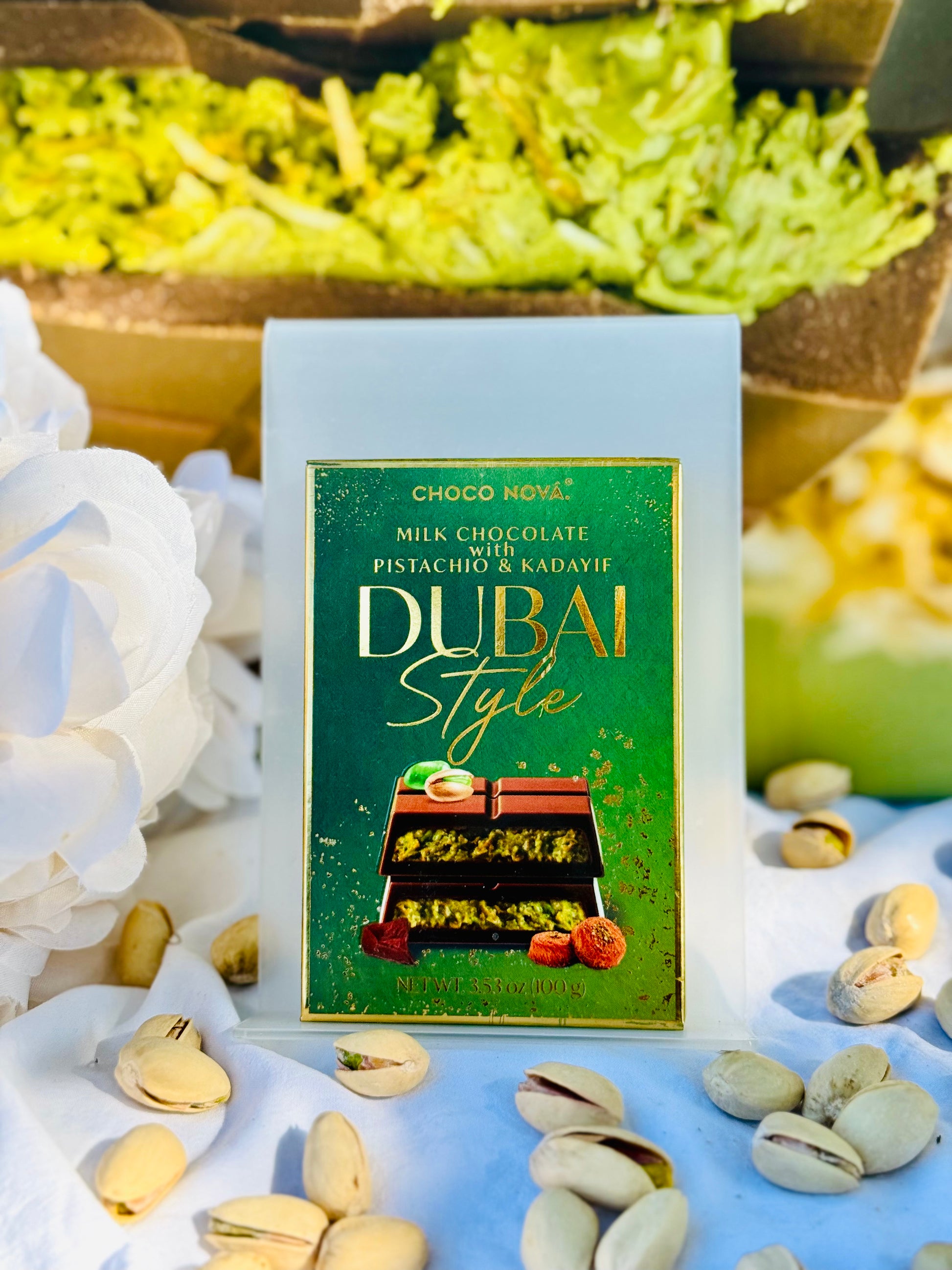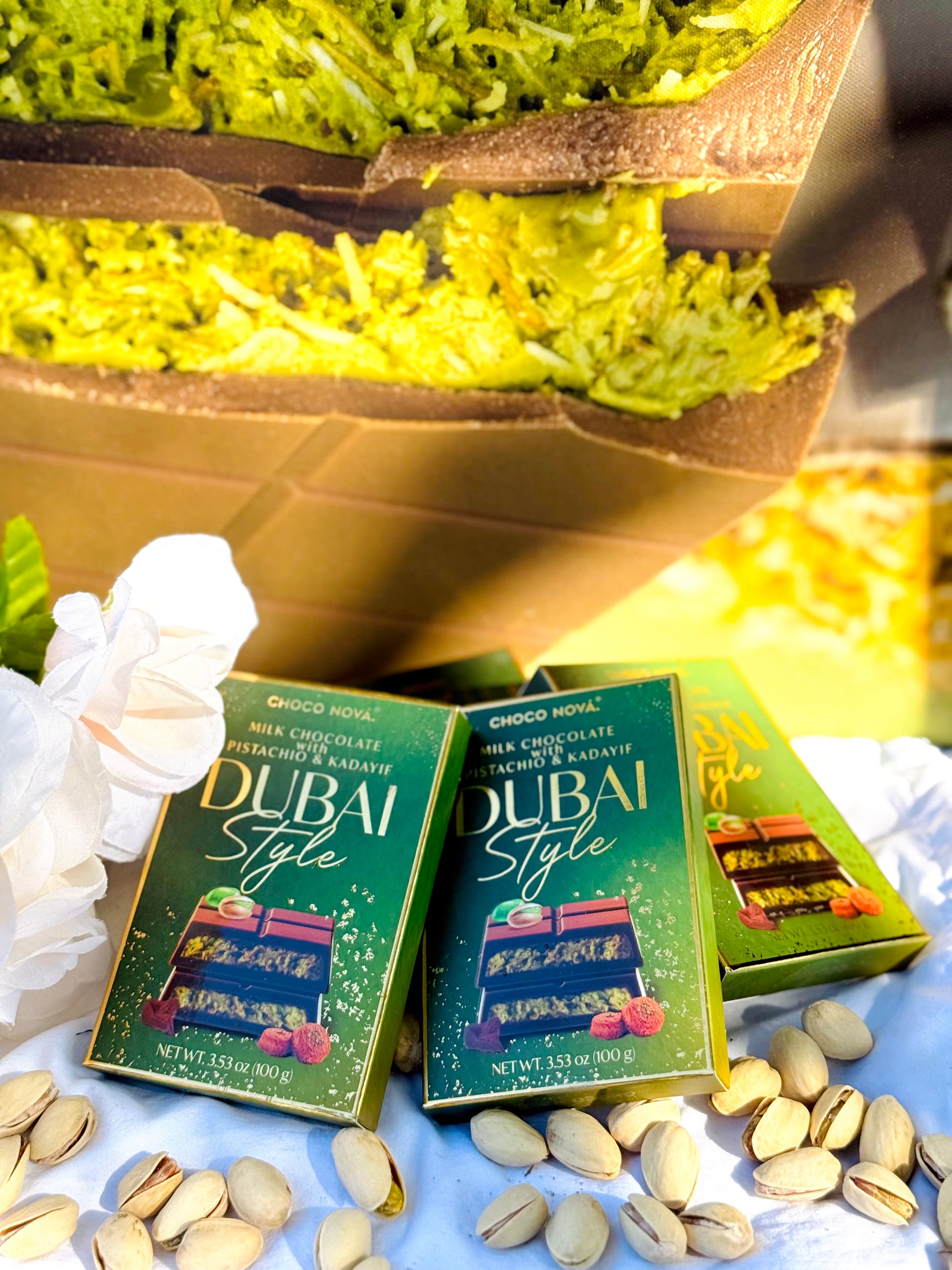 Discover the smooth richness of Choco Nova’s Dubai Style Milk Chocolate, crafted with premium pistachios and crunchy kadayıf.